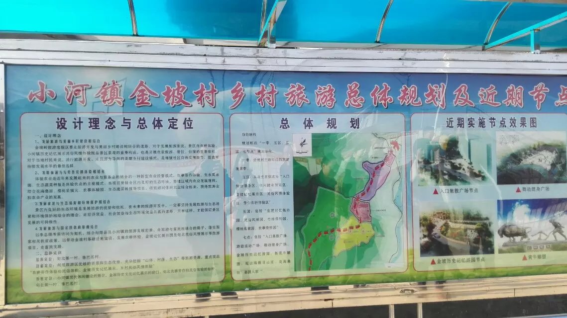 鄉(xiāng)村旅游發(fā)展規(guī)劃正在實(shí)施,根據(jù)《旬陽(yáng)縣小河鎮(zhèn)金坡村鄉(xiāng)村旅游度假區(qū)總體規(guī)劃及主要節(jié)點(diǎn)方案設(shè)計(jì)》,規(guī)劃中對(duì)金坡村的形象定位為:小河鎮(zhèn)居民休閑健身的舞臺(tái);金坡歷史文化記憶展示的窗口;旬北農(nóng)耕勞作和民俗體驗(yàn)的標(biāo)桿,一個(gè)生態(tài)、旅游、民富的新金坡即將展現(xiàn)在世人面前。