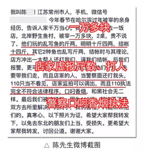 陳先生在微博上發(fā)文描述了自己春節(jié)在哈爾濱被宰的經歷,“萬元鐵鍋燉”的遭遇讓大多數(shù)網友同情,并“一片倒”地譴責北岸野生漁村餐廳“坑人又跌份”。