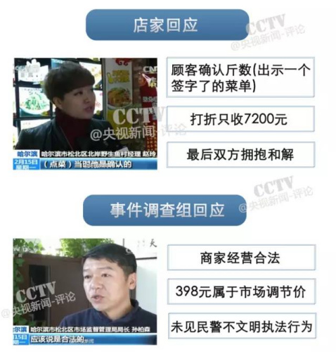 隨即媒體爆出更多細節(jié),諸如“北岸野生漁村飯店”工商登記實為“北岸漁村飯店”,并無標榜的“野生”二字;餐飲服務許可證已于2月4日到期;更多同時同地的宰客事件被爆出;當?shù)貙в伪,帶游客去涉事飯店消費可獲60%提成。