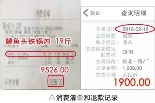 與陳先生有相同遭遇的上海趙先生向媒體反饋,2月8日曾與家人在涉事飯店消費19斤鰉魚頭,花費9526元,向當?shù)?2358熱線投訴后,昨日收到涉事飯店1900元賠償款。