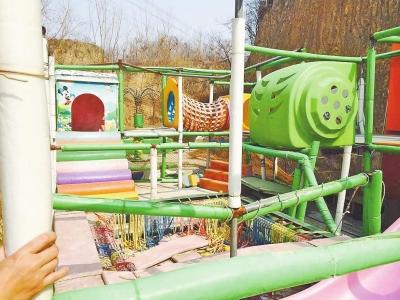 接到讀者報料后,記者當(dāng)天上午就找到了蝴蝶谷體育公園。它位于鄭州尖崗水庫西側(cè)金蝶路旁,與婁河村毗鄰。記者在現(xiàn)場看到,公園門前的那條路上堆積著大量建筑垃圾,而門口修建的停車場,亦被黃土覆蓋。再往里走,內(nèi)設(shè)兒童滑梯已經(jīng)塌了,板凳馬、推鐵環(huán)、旱龍舟、風(fēng)火輪,趣味擂臺等場地設(shè)施,不是荒廢便是破成一堆,鐵欄桿上銹跡斑斑。