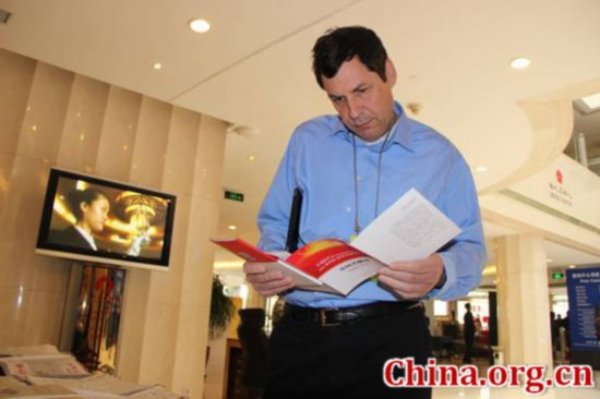 美國(guó)彭博新聞社記者馬克·邁爾尼克認(rèn)真翻閱《中國(guó)關(guān)鍵詞》。[中國(guó)網(wǎng) 吳瓊靜 攝]
