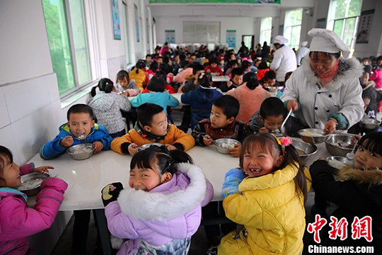 資料圖:學(xué)生們正在新建的學(xué)生食堂吃著營(yíng)養(yǎng)午餐。 中新社發(fā) 劉杰華 攝