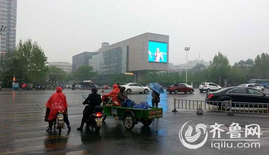 經(jīng)十路舜耕路交叉口,行人在雨中等候信號燈(記者黃鵬偉攝)