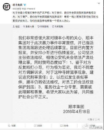 快遞員被扇耳光續(xù):順豐再聲明稱不同意對(duì)方調(diào)解訴求