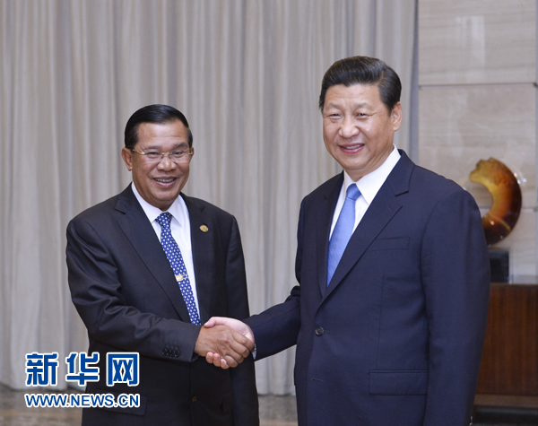 2013年4月7日,中國國家主席習(xí)近平在海南博鰲會見出席博鰲亞洲論壇2013年年會的柬埔寨首相洪森。 新華社記者王曄攝
