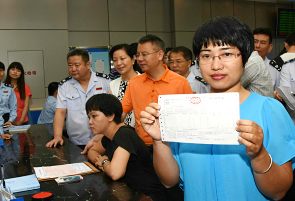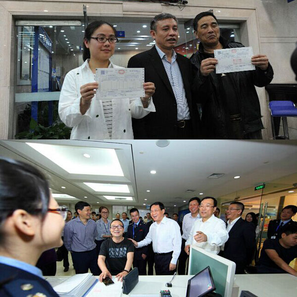 【江西】5月1日,納稅企業(yè)代表(左)從南昌市國(guó)稅局工作人員手中領(lǐng)取營(yíng)改增試點(diǎn)全面推開(kāi)后江西省首張?jiān)鲋刀惏l(fā)票。