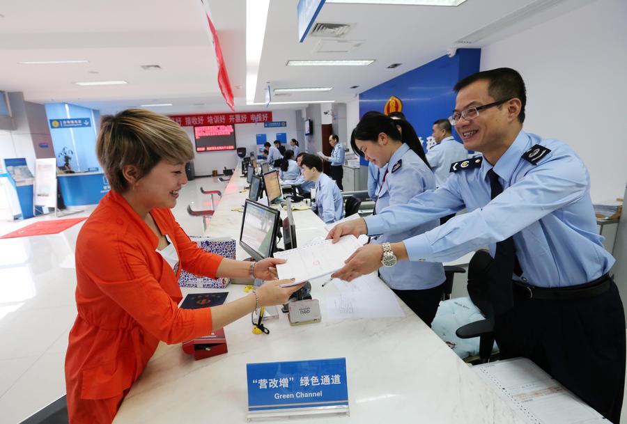 【廣西】5月1日,在廣西柳州市融安縣國(guó)稅局辦稅大廳,工作人員為納稅人辦理增值稅普通發(fā)票領(lǐng)用業(yè)務(wù)。當(dāng)日,營(yíng)業(yè)稅改征增值稅改革在全國(guó)推開(kāi)。
