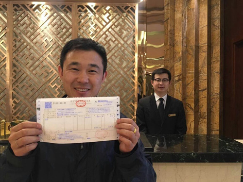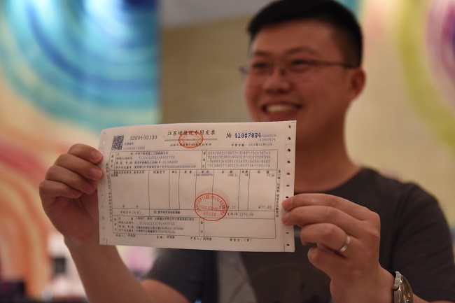 【福建】5月1日,住客謝平在展示由福州大飯店開(kāi)出的營(yíng)改增試點(diǎn)全面推開(kāi)后福建省首張?jiān)鲋刀惏l(fā)票。