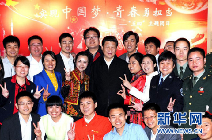 2013年5月4日,中共中央總書記、國家主席、中央軍委主席習(xí)近平來到中國航天科技集團(tuán)公司中國空間技術(shù)研究院,同各界優(yōu)秀青年代表座談并發(fā)表重要講話。座談會(huì)前,習(xí)近平和王靈光(前排左一)以及在展廳參觀的優(yōu)秀青年代表合影。新華社記者 饒愛民 攝