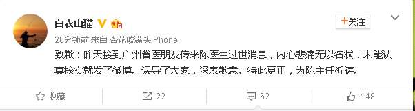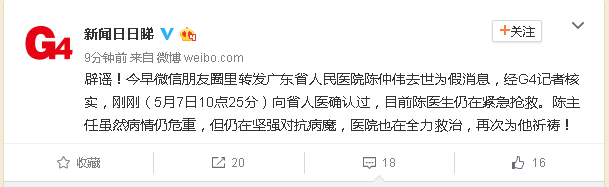 今天上午,有網友在微博爆出陳仲偉主任因搶救無效死亡的消息。但經核實,截止今天上午10點25分,陳仲偉依然還在搶救。此前發(fā)布該消息的網友也在微博中道歉,表示:“未能認真核實就發(fā)了微博。誤導了大家!