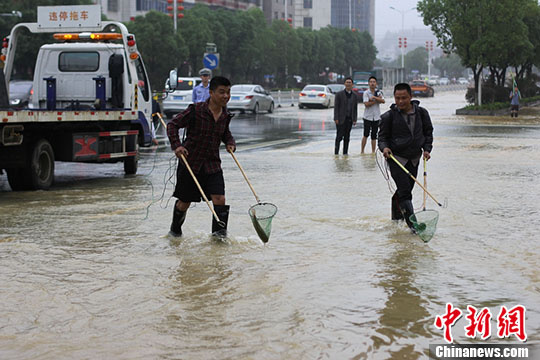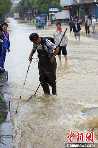 5月8日,湖南省永州市道縣再遭大暴雨襲擊,縣城多處低洼處被水淹,農作物、水產(chǎn)養(yǎng)殖損失嚴重,不少民眾拿起漁具到被淹沒的馬路上捕魚。目前,道縣搶險、核災和災后自救工作已全面有序展開。