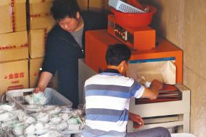 9點25分,一輛銀灰色的微型車來到車庫前,微型車后排放著一些裝著餐具的綠色塑料筐和幾塊毛巾。車上的男子把塑料筐搬到車庫里,兩名工人繼續(xù)將這些餐具放在包膜機上進行包裝。