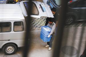 9點40分,所有的餐具包膜完畢。整個過程中,都市時報記者并未見到有消毒的過程。緊接著,兩名男子將包裝好的餐具用塑料筐裝好后抬上了微型車,該車開走后。接著,工人們又往另一輛曲靖車牌的微型車上繼續(xù)裝消毒餐具,10分鐘后,車上裝了七八筐包裝好的餐具。裝貨完畢,兩名男子鎖上車庫門,上了微型車離開了小區(qū)。