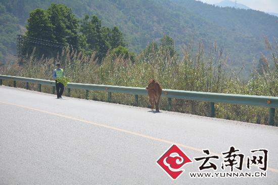 云南網(wǎng)訊(記者 楊之輝 通訊員 張鵬翔 肖珩)一頭黃牛在高速路上到處亂串,嚇得過(guò)往車輛紛紛緊急避讓,云南大保高速路交警接警后,及時(shí)將牛驅(qū)離高速路,消除了安全隱患。