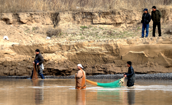 3月9日,濟南,在放生點的下游100米處,村民身穿連體防水服,帶著漁具站在齊腰深的黃河水中,撒網(wǎng)捕撈剛剛放生的魚兒。 視覺中國供圖