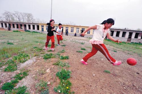 三名學(xué)生在校舍前的荒地上玩著“跳格子”游戲,游戲中投擲用的布口袋被隨手撿來的石塊替代。學(xué)生校服上的“蘇子峪小學(xué)”字樣是這個(gè)學(xué)校的唯一文字標(biāo)識(shí)。男孩名叫金恒宇,是這個(gè)學(xué)校和班級(jí)里唯一的男生。金恒宇玩起這原本不是男孩子的游戲時(shí),也顯得十分熟練。董思沂和張欣逸專注地看著金恒宇的每個(gè)動(dòng)作,如有違規(guī)就會(huì)被她倆中的一位替換下來。三人互為裁判,玩得認(rèn)真而開心。游戲間,一位村民趕著幾十只山羊穿過,學(xué)生們看上去儼然已經(jīng)習(xí)慣了這樣的場(chǎng)面。山羊在操場(chǎng)上還忙著啃上幾口青草,隨后被陸續(xù)趕進(jìn)隔壁荒廢的教室,山羊過后在草地上留下散落的“羊糞蛋”。