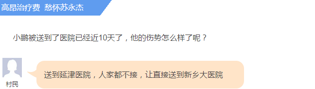 從村民的話中,不難聽出小鵬傷勢的嚴重性。在新鄉(xiāng)市第二人民醫(yī)院,小鵬已經(jīng)在重癥監(jiān)護室里躺了9天了。小鵬的爸爸蘇永杰說:光手術(shù)就花了5萬(含:傷情,醫(yī)療費)蘇永杰告訴記者,前段時間家里蓋房子借親戚朋友的錢還沒有還完,現(xiàn)在小鵬的醫(yī)療費又花了10多萬,已經(jīng)把他壓的喘不過氣來。