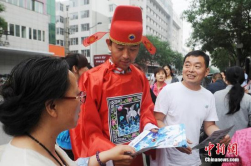 6月7日,山西太原一高考考點(diǎn),由商家扮演的“狀元郎”為等候考生的家長(zhǎng)派發(fā)紙扇和宣傳單,引人注目。 中新社記者 韋亮 攝