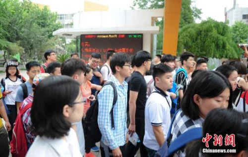 6月7日,2016年中國(guó)高考正式拉開(kāi)大幕。今年高考采用全國(guó)統(tǒng)一命題試卷的省份增加至26個(gè),作為“作弊入刑”后的首次高考,今年高考考場(chǎng)紀(jì)律被媒體稱(chēng)為“史上最嚴(yán)”。圖為河北石家莊的考生們?cè)谙嗷プ8!?中新社記者 翟羽佳 攝