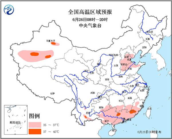 中央氣象臺(tái)預(yù)計(jì),26日白天,江南南部、華南大部、華北中南部等地有35℃以上的高溫天氣,其中,廣東北部、江西南部、福建南部等地的部分地區(qū)最高氣溫可達(dá)37~39℃。為此,中央氣象臺(tái)26日6時(shí)繼續(xù)發(fā)布高溫黃色預(yù)警。