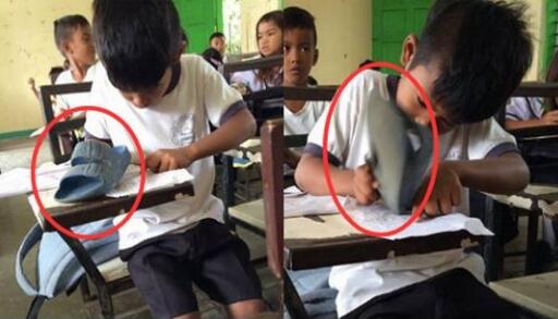 橡膠鞋子當橡皮擦,菲律賓貧童感動人。(圖片來源網(wǎng)絡)