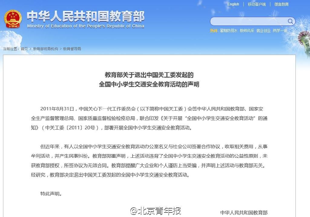 教育部的聲明寫道,近年來,有人以全國中小學生交通安全教育活動辦公室名義與社會公司簽署合作協(xié)議,收取相關費用,從事牟利活動,并產生民事糾紛。教育部鄭重聲明,上述活動違背了全國中小學生交通安全教育活動的公益性原則,未獲教育部授權,所簽協(xié)議為無效合同。教育部提醒廣大企業(yè)和個人謹防上當受騙,并聲明上述活動與教育部無關。經(jīng)研究,教育部決定退出中國關工委發(fā)起的全國中小學生交通安全教育活動。