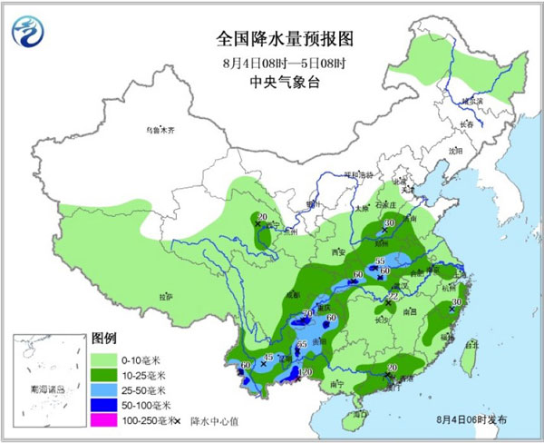 降水方面,今天白天到夜間,貴州中西部、云南中南部、四川盆地東南部、湖北西部和北部、河南南部等地有大雨或暴雨,其中,云南東南部的局部地區(qū)有大暴雨(100~120毫米)。上述局地并伴有短時強降雨、雷暴大風(fēng)或冰雹等強對流天氣。