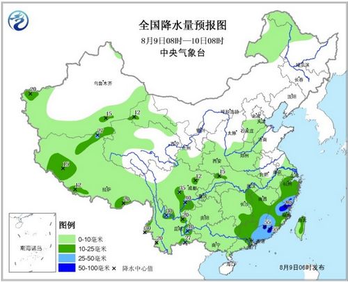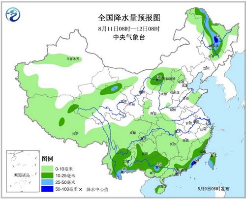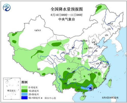 圖1 全國降水量預報圖(8月9日08時—10日08時)