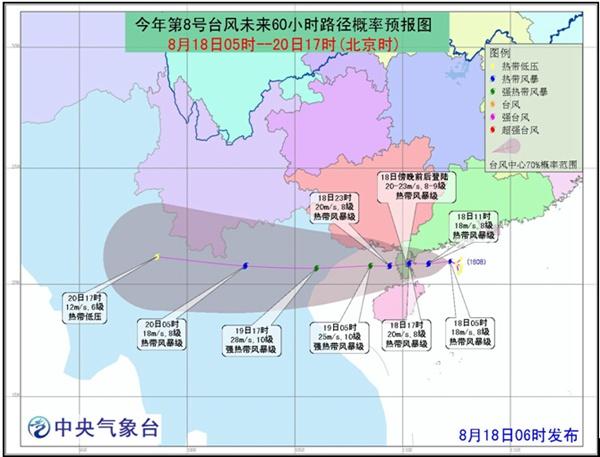 今晨,南海熱帶低壓已加強(qiáng)為今年第8號(hào)臺(tái)風(fēng)。中央氣象臺(tái)監(jiān)測(cè)顯示,今晨5時(shí),其中心位于廣東湛江以東大約195公里的海面上,中心附近最大風(fēng)力有8級(jí)(18米/秒)。預(yù)計(jì),將以每小時(shí)15公里左右的速度向偏西方向移動(dòng),將于18日傍晚前后登陸廣東雷州半島(20~23米/秒,8~9級(jí),熱帶風(fēng)暴級(jí)),18日晚上移入北部灣,強(qiáng)度將進(jìn)一步加強(qiáng),最強(qiáng)可達(dá)強(qiáng)熱帶風(fēng)暴級(jí)(25~30米/秒,10~11級(jí))。