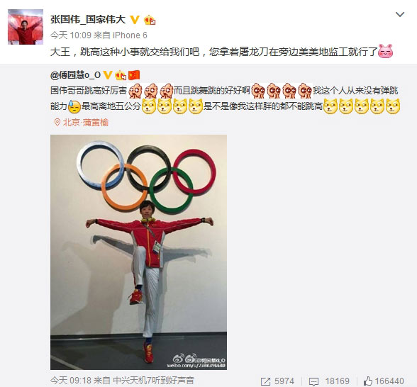 盡管這條微博沒(méi)有@張國(guó)偉,但是他還是回復(fù)了:“大王,跳高這種小事就交給我們吧,您拿著屠龍刀在旁邊美美地監(jiān)工就行了!睆垏(guó)偉回復(fù)的“大王!眮(lái)自于此前傅園慧的微博,她自我調(diào)侃是大王。