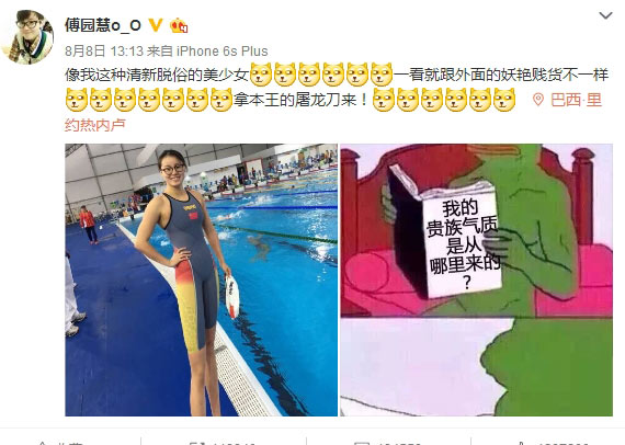 北京時(shí)間8月18日,洪荒少女傅園慧的偶像是誰(shuí)?我們可以從她微博中看出來(lái),至少其中之一是跳高選手張國(guó)偉;貒(guó)的洪荒少女和“泥石流”今天在微博上互動(dòng)了!