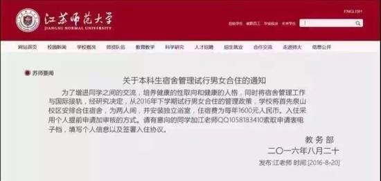 這條《關于本科生宿舍管理試行男女合住的通知》稱,從2016年下學期試行男女合住的管理政策,學校將首先泉山校區(qū)安排合住宿舍,為兩人間,并安裝獨立浴室,住宿費為每年1600元。