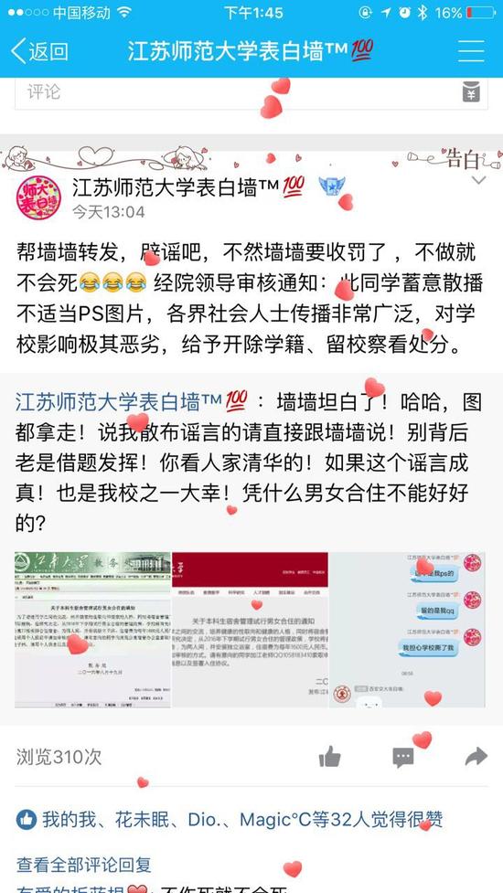 現(xiàn)代快報訊(記者 李偉豪)8月20日上午,一條截圖在微信朋友圈迅速傳開。截圖顯示是江蘇師范大學官網(wǎng)發(fā)布的一條通知,通知稱校方共2016年第二學期開始,可以申請男女合住。不過,很快,該校便通過官方微博辟謠,表示此為惡意造謠,保留追究造謠者發(fā)了責任的權利。
