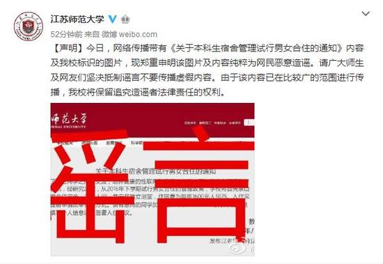 下午,江蘇師范大學通過官方微博發(fā)布聲明,稱該事件為謠言: