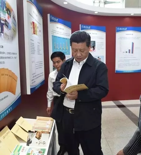 2014年9月9日,習(xí)近平在北師大考察,從展臺(tái)上拿起一本課標(biāo)書翻看。新華社記者馬占成攝