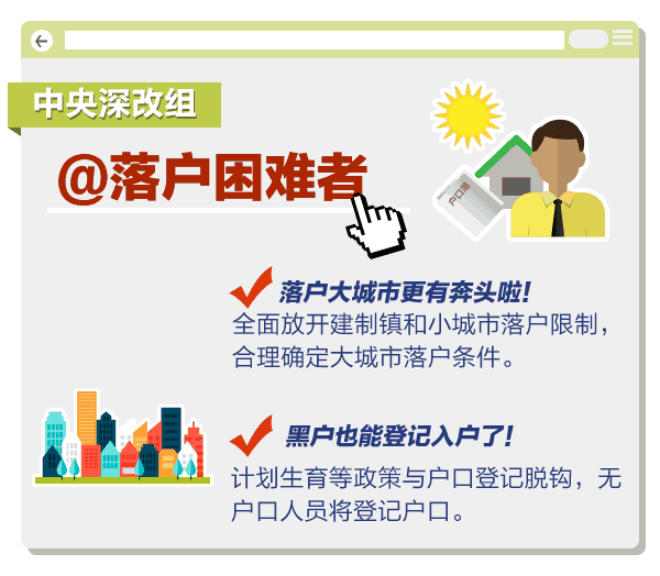 造福民眾讓深改組的故事深入人心。對重大改革尤其是涉及人民群眾切身利益的改革決策,深改組建立了社會(huì)評估機(jī)制。遇到關(guān)系復(fù)雜、牽涉面廣、矛盾突出的改革,深改組總能從人民的實(shí)際利益出發(fā)謀劃方案、制定舉措、推進(jìn)落實(shí)。群眾生活情況怎么樣?群眾訴求是什么?改革能給群眾帶來哪些獲得感?總是深改組最關(guān)心的問題。1000天來,深改組先后對改革行政審批制度、改革工商注冊制度、推進(jìn)社會(huì)主義核心價(jià)值體系建設(shè)、實(shí)施單獨(dú)兩孩政策、廢止勞動(dòng)教養(yǎng)制度、改革和完善干部考核評價(jià)制度、改進(jìn)干部選拔任用機(jī)制、堅(jiān)持厲行節(jié)約反對浪費(fèi)、深入開展黨風(fēng)廉政建設(shè)和反腐敗斗爭等全社會(huì)高度關(guān)注、各方面抱有急切期盼的一系列問題,及時(shí)組織有關(guān)部門進(jìn)行研究,出臺(tái)了系列政策措施和制度文件,有的還做出了法律決定。這些改革措施涉及到百姓生活的方方面面,對我國經(jīng)濟(jì)發(fā)展和民生改善產(chǎn)生了巨大的推動(dòng)作用和深遠(yuǎn)的社會(huì)影響。深改組在涉及農(nóng)民利益和城鄉(xiāng)關(guān)系等問題上動(dòng)真刀、亮真槍。推進(jìn)人的城鎮(zhèn)化的重要環(huán)節(jié)在戶籍制度,加快戶籍制度改革,是涉及億萬農(nóng)業(yè)人口轉(zhuǎn)移的重大舉措。深改組推出了尊重城鄉(xiāng)居民自主自愿、合理引導(dǎo)農(nóng)業(yè)人口轉(zhuǎn)移落戶城鎮(zhèn)的戶籍制度改革方案。為了促進(jìn)大中小城市和小城鎮(zhèn)合理布局、功能互補(bǔ),搞好基本公共服務(wù),維護(hù)好農(nóng)民的土地承包經(jīng)營權(quán)、宅基地使用權(quán)、集體收益分配權(quán),深改組陸續(xù)推出了《關(guān)于引導(dǎo)農(nóng)村土地承包經(jīng)營權(quán)有序流轉(zhuǎn)發(fā)展農(nóng)業(yè)適度規(guī)模經(jīng)營的意見》和《積極發(fā)展農(nóng)民股份合作賦予集體資產(chǎn)股份權(quán)能改革試點(diǎn)方案》等舉措,為農(nóng)民在城鎮(zhèn)化進(jìn)程獲得更大的土地轉(zhuǎn)讓收益掃清了障礙。