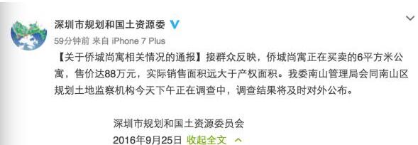 9月25日17時56分,@深圳市規(guī)劃和國土資源委官方微博發(fā)布關(guān)于僑城尚寓相關(guān)情況的通報。
