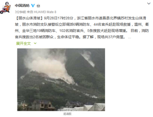 央廣網(wǎng)北京9月28日消息 據(jù)公安部消防局官方微博消息,9月28日17時(shí)28分,浙江省麗水市遂昌縣北界鎮(zhèn)蘇村發(fā)生山體滑坡,目前,消防官兵搜救出2名被困群眾,生命體征平穩(wěn)。據(jù)了解,現(xiàn)場(chǎng)共37戶房屋。同時(shí),村莊旁邊小溪形成堰塞湖,可能發(fā)生局部二次滑坡。