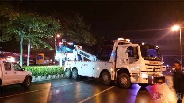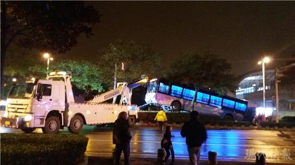 晚上7點(diǎn)50左右,現(xiàn)代快報(bào)記者在現(xiàn)場(chǎng)看到,事故發(fā)生在地鐵二號(hào)線羊山地鐵站附近的仙境路上,出租車已被救援走,一輛吊車正在把公交車從綠化帶上吊出。事發(fā)時(shí),公交車正從學(xué)原路·中醫(yī)藥大學(xué)站開往中醫(yī)藥大學(xué)站。兩車應(yīng)該是剛過仙林大道十字路口就發(fā)生了撞擊,事故留下的碎玻璃,從在仙境路上由南向北遺落了四五十米。