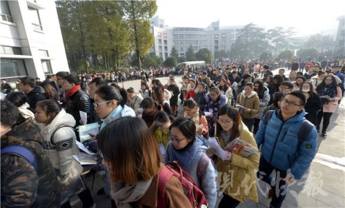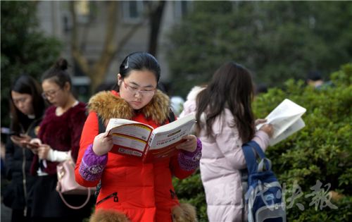 考生們進場前還要“抱下佛腳”,不過考題的知識點跨度很大。新華報業(yè)視覺中心記者 邵丹 攝 2017國家公務(wù)員招錄筆試已正式開考,昨天是國考行測和申論考試的“大日子”,共有64124名考生選擇了江蘇考區(qū)參加國考。