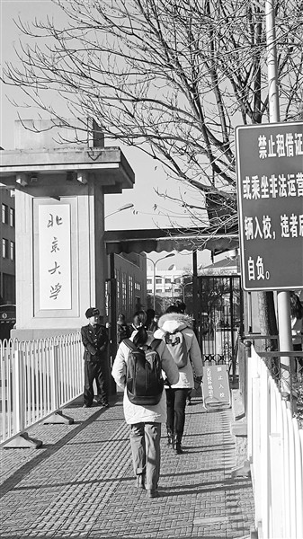 北京大學(xué)校門外豎立著標(biāo)有“無證校外電動(dòng)車禁止入內(nèi)”的牌子