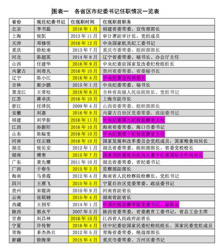 由此可見,2015年3月以來新任的19名省級紀(jì)委書記(圖表一中標(biāo)注黃色者),都是按照《省(自治區(qū)、直轄市)紀(jì)委書記、副書記提名考察辦法(試行)》的要求選任的,提名以中央紀(jì)委會同中央組織部為主,既可以從紀(jì)檢監(jiān)察系統(tǒng)內(nèi)部也可以在系統(tǒng)外產(chǎn)生提名人選。在19人中,鄧修明、任建華、陳小江、劉惠、劉學(xué)新、陳輻寬、傅奎、于春生、許傳智等9人曾有過紀(jì)檢監(jiān)察機(jī)關(guān)任職履歷;而其余10人則從無紀(jì)檢監(jiān)察崗位任職經(jīng)歷,為系統(tǒng)外提名產(chǎn)生,兩者的比例恰好大致各占了一半。從人選任現(xiàn)職前的職務(wù)來看,符合《提名考察辦法》規(guī)定的要求,全部為交流任職。