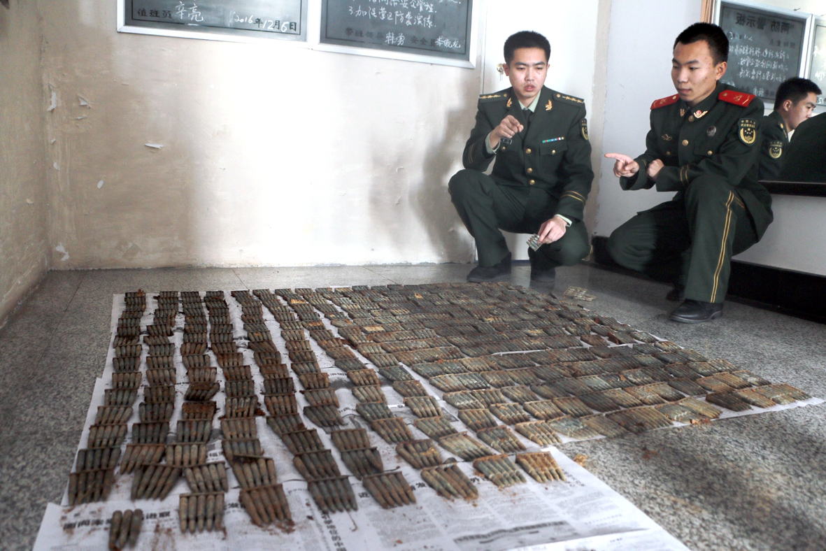 平陽(yáng)邊防派出所官兵經(jīng)過(guò)細(xì)致的挖掘后,邊防官兵把這批子彈帶回派出所。據(jù)雞西公安邊防支隊(duì)平陽(yáng)邊防派出所副教導(dǎo)員張家銘介紹,經(jīng)點(diǎn)驗(yàn)這批子彈共1555發(fā),外面包著一層黃油紙,黃油紙具有一定的防腐蝕性,子彈保存非常好。