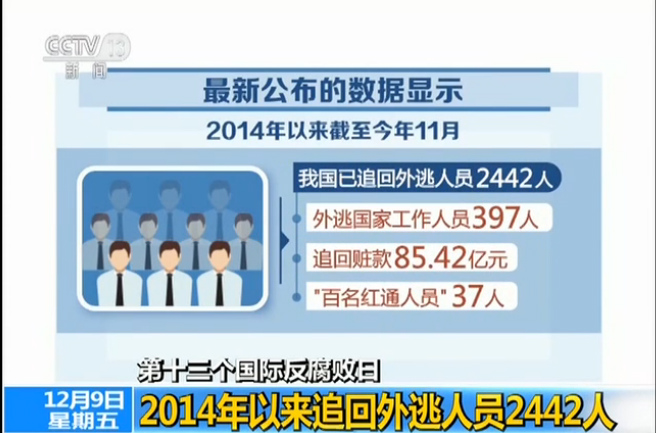 中央反腐敗協(xié)調(diào)小組國際追逃追贓工作辦公室最新公布的數(shù)據(jù)顯示,2014年以來,截至今年11月,我國已追回外逃人員2442人,其中外逃國家工作人員397人,追回贓款85.42億元,“百名紅通人員“37人。
