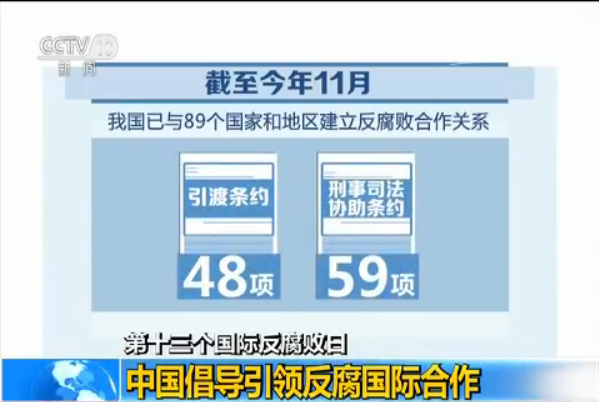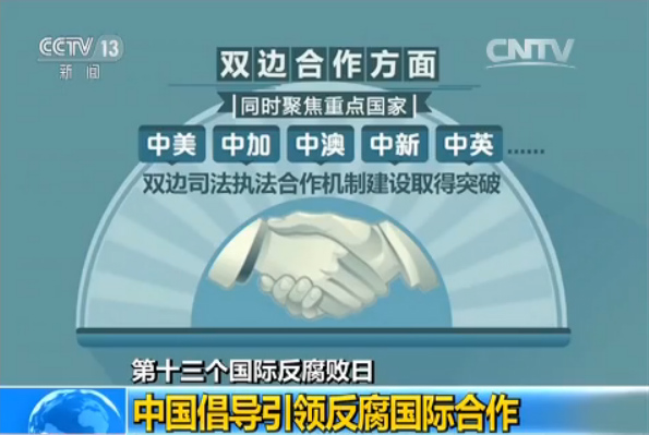 央視網(wǎng)消息:今天(9日)是聯(lián)合國確定的第十三個(gè)國際反腐敗日,今年的主題是“聯(lián)手反腐敗,實(shí)現(xiàn)和平、發(fā)展和安全”。中央反腐敗協(xié)調(diào)小組國際追逃追贓工作辦公室公布了我國在反腐敗國際合作方面取得的最新成果。