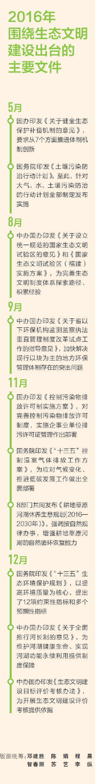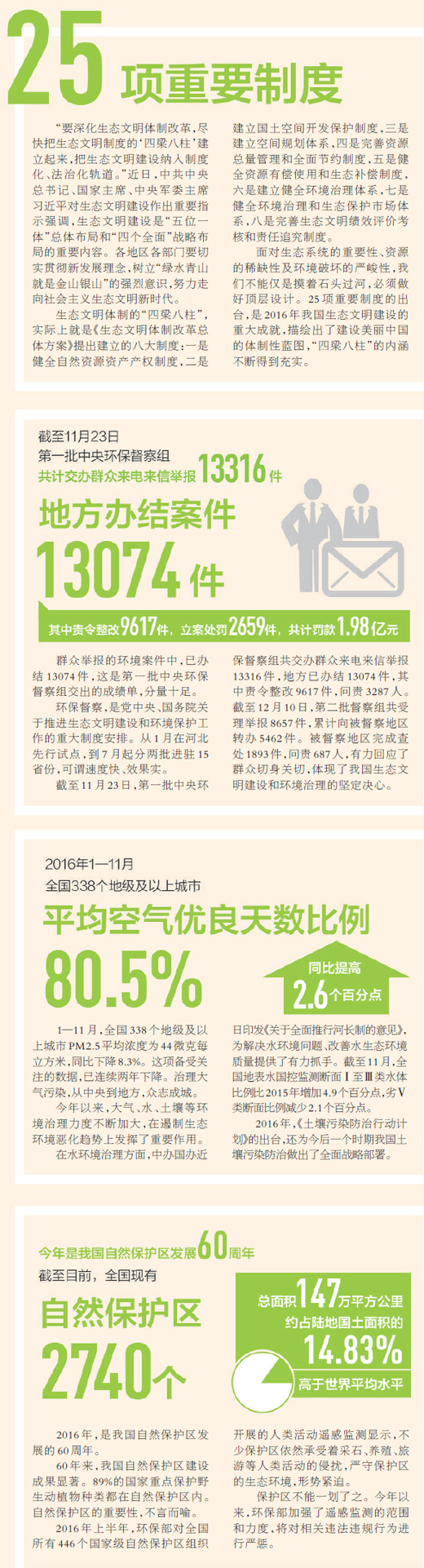 盤點2016年生態(tài)環(huán)保領(lǐng)域大事,令人振奮。從中央環(huán)保督察制度形成到省以下環(huán)保機構(gòu)垂直管理試點,從國家生態(tài)文明試驗區(qū)試點到生態(tài)環(huán)境損害賠償制度試點,生態(tài)文明制度建設(shè)已經(jīng)按下快進鍵,改革步伐加快,成果有目共睹。