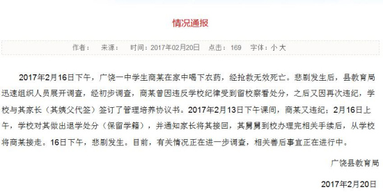 通報(bào)稱,2017年2月16日下午,廣饒一中學(xué)生商某在家中喝下農(nóng)藥,經(jīng)搶救無效死亡。悲劇發(fā)生后,縣教育局迅速組織人員展開調(diào)查,經(jīng)初步調(diào)查,商某曾因違反學(xué)校紀(jì)律受到留校察看處分,之后又因再次違紀(jì),學(xué)校與其家長(其姨父代簽)簽訂了管理培養(yǎng)協(xié)議書。2017年2月13日下午課間,商某又違紀(jì);2月16日上午,學(xué)校對其做出退學(xué)處分(保留學(xué)籍),并通知家長將其接回,其舅舅到校辦理完相關(guān)手續(xù)后,從學(xué)校將商某接走。16日下午,悲劇發(fā)生。目前,有關(guān)情況正在進(jìn)一步調(diào)查,相關(guān)善后事宜正在進(jìn)行中。