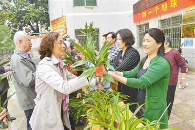 江西新余渝水區(qū)電工廠社區(qū),居民們?cè)谟脧U電池?fù)Q鮮花綠植。人民視覺(jué)