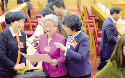 3月6日上午,人大江蘇代表團在駐地舉行全體會議,審議政府工作報告。審議結(jié)束后,林志梅、孫秀芳、張紅三位代表(從左至右)就報告中相關(guān)章節(jié)繼續(xù)討論。本報記者 李景錄攝